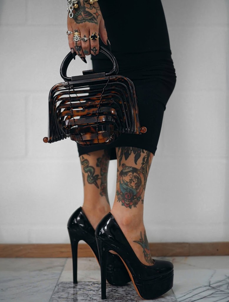 A figure-hugging, all black, strapless dress from Wolford makes for endless styling possibilities. Keeping it real simple here – I’ve paired it sky high patent platforms, a killer statement Cult Gaia tortoise-shell bag, and a red lip – all picked up via Amazon Fashion.